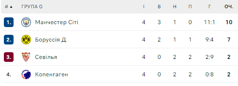 В группе G лидирует «Ман Сити» (10 очков), «Боруссия» Д набрала 7 пунктов, а «Севилья» и «Копенгаген» (по 2 очка) будут вести борьбу за третье место и переход в Лигу Европы.