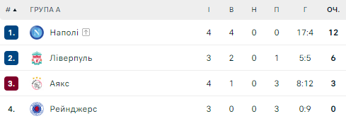 «Наполи» набрал 12 очков из 12 возможных и обеспечил себе выход в плей-офф. Подопечные Лучано Спаллетти выиграли все 4 матча в группе А. «Аякс» с 3 очками идет на третьей позиции.