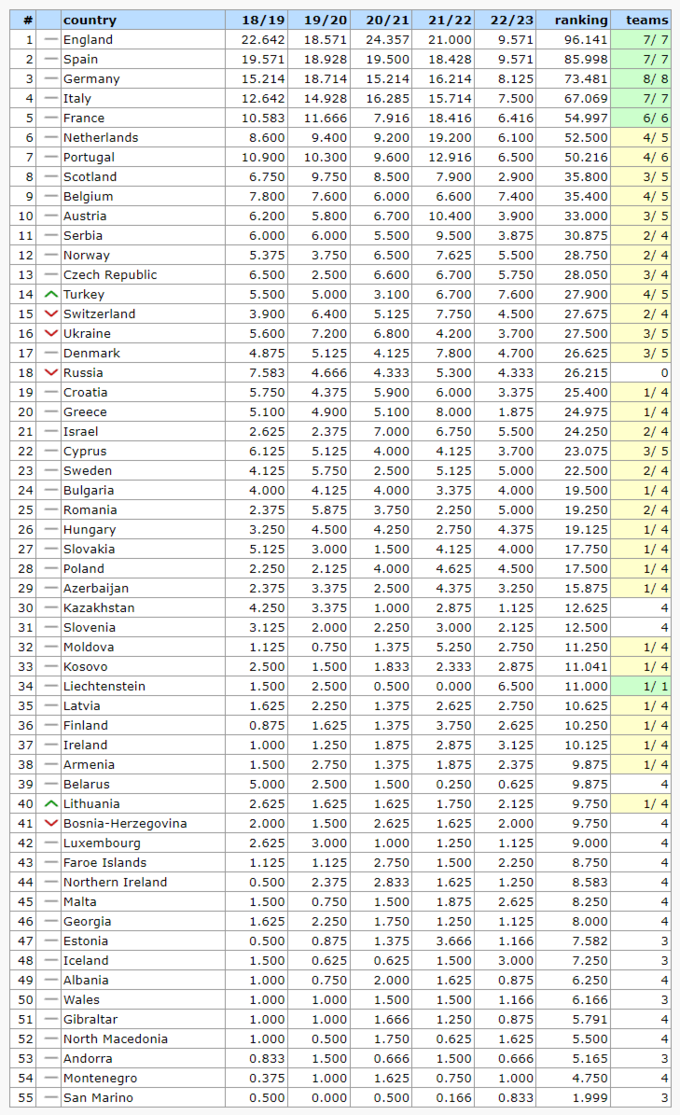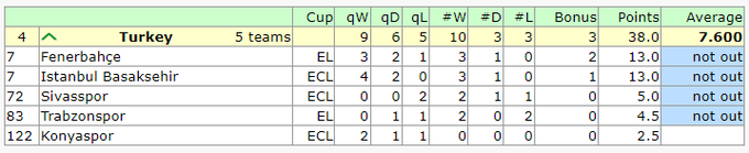 У Турции 4 клуба одержали в четверг 4 победы (Фенербахче, Трабзонспор, Башакшехир, Сивасспор) и совершила мощнейший рывок на 4 позиции вверх (+2.200 за неделю с учетом бонусов за проход дальше), обогнав заодно Украину, Швейцарию, Данию и россию.