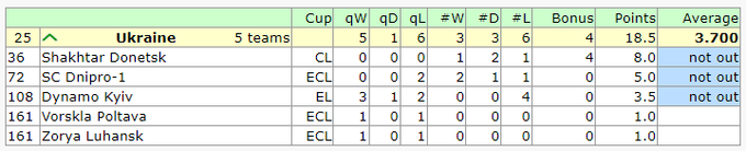 За неделю Украина прибавила к рейтингу 0.600 баллов (победа и ничья дали 3 очка, деленные на 5 клубов). Сезонный набор составляет 3.700, и это 25-е место в текущей еврокампании.