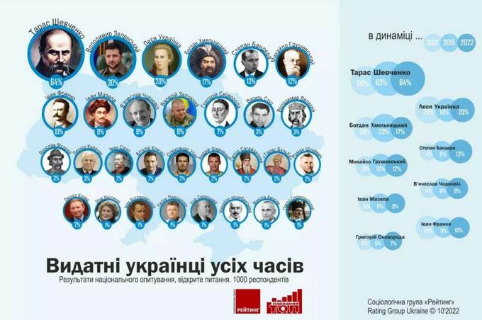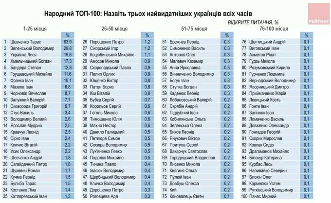 Лидером рейтинга стал Тарас Шевченко, получивший поддержку 63,9% респондентов. В первую пятерку также вошли действующий президент страны Владимир Зеленский (29,8%), Леся Украинка (19,6%), Богдан Хмельницкий (17,3%) и Степан Бандера (12,85).