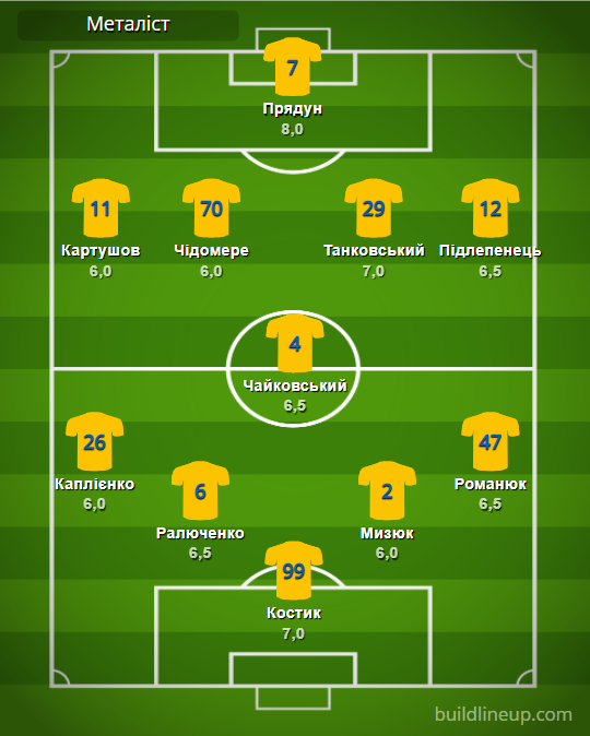 «Металлист»: Костик – Каплиенко, Ралюченко, Мизюк, Романюк – Чайковский – Картушов (Кныш, 76), Чидомере (Демченко, 46), Танковский (Панасенко, 88), Подлепенец – Прядун (Рязанцев, 83).