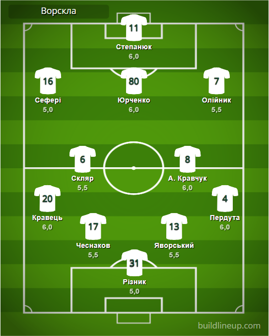 «Ворскла»: Ризнык – Кравец, Чеснаков (Зайков, 79), Яворский (Марлисон, 65), Пердута – Скляр, А. Кравчук (Бацула, 65) – Сефери, Юрченко, Олейник (Тотре, 79) – Степанюк (Кулаковский, 79).
