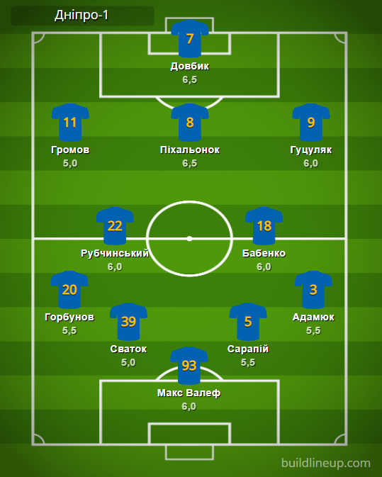 «Днепр-1»: Макс Валеф – Горбунов, Сваток, Сарапий, Адамюк (Назаренко, 56) – Рубчинский (Когут, 67), Бабенко – Громов (Танчик, 55), Пихаленок (Логинов, 87), Гуцуляк – Довбик.