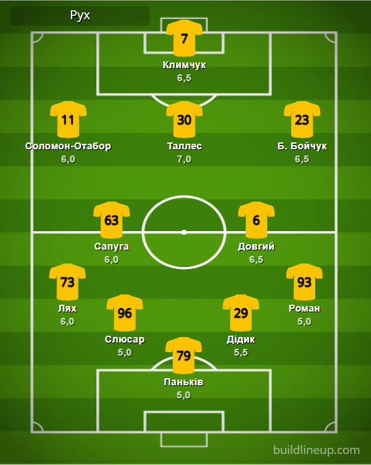 «Рух»: Паньків – Лях, Дидык, Слюсар, Роман – Сапуга, Довгий – Соломон-Отабор (Рунич, 87), Таллес (Мысык, 65), Б. Бойчук (Карабин, 90+2) – Климчук.
