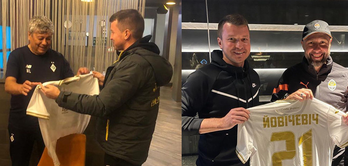Главный тренер молодежной сборной Украины Руслан Ротань презентовал памятные футболки главным тренерам киевского «Динамо» и донецкого «Шахтера» — Мирче Луческу и Игору Йовичевичу соответственно. Об этом сообщил украинский журналист Евгений Гресь:
