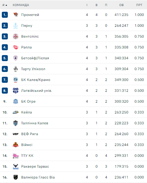 Прометей (Украина) – Раквере Тарвас (Эстония) – 106:50 (27:16, 33:11, 28:9, 18:14)