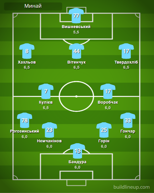 «Минай» (замены): Трубочкин – 6,0, Чуев – б/о, Коломоец – б/о, Дмитрук – б/о, Байдал – б/о.