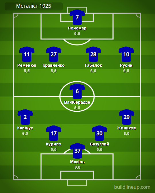 «Металлист 1925»: Мозиль – Капинус, Курило, Безуглый, Жичиков – Габелок, Кравченко, Вачиберадзе – Русин (Бычек, 75), Пономарь, Ременюк.