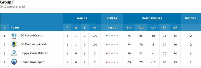 Киевский клуб стартовал в групповом раунде с гостевой победы над итальянским «Бриндизи» со счетом 74:70. Самым результативным баскетболистом в составе «Будивельника» стал Арчи Гудвин, набравший 19 очков. «Калев/Крамо» начал групповой турнир также с победы. Эстонцы в Таллине обыграли голландский «Гронинген» со счетом 75:65.