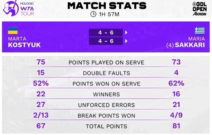 Марта Костюк (Украина) – Мария Саккари (Греция) – 4:6, 4:6