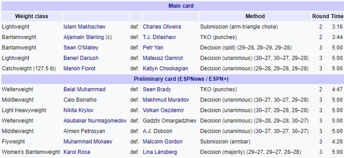 - Ислам Махачев (россия) победил Чарльза Оливейру (Бразилия) – сабмишн, 2-й раунд
