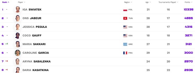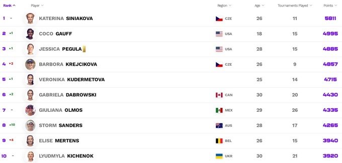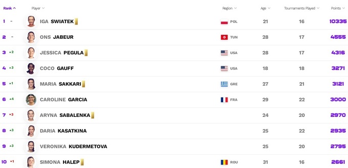 Личный рекорд обновила Кори Гауфф, которая поднялась на четвертую позицию. Каролина Гарсия с десятой позиции переместилась на шестую, Паула Бадоса и Анетт Контавейт покинули топ-10.