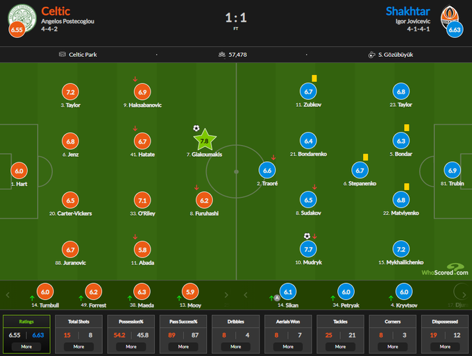 Лучшим игроком донецкого клуба по оценкам WhoScored стал автор гола Михаил Мудрик (оценка 7.7).