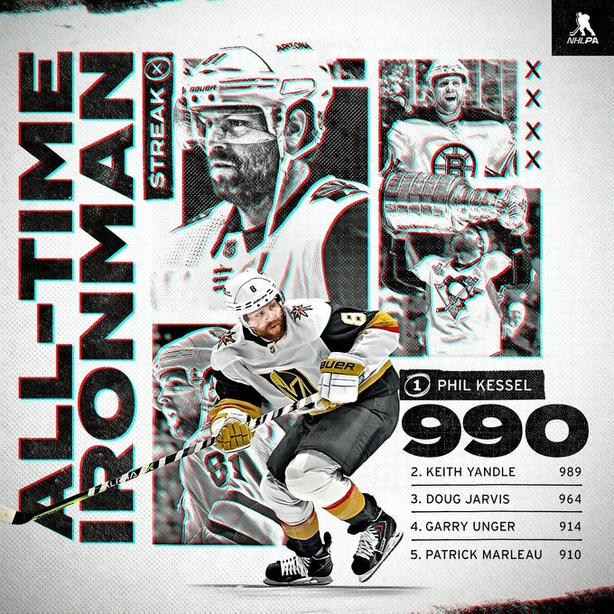 В поединке регулярного сезона НХЛ Сан-Хосе - Вегас форвард Золотых Рыцарей Фил Кессел установил рекорд Лиги по количеству проведенных подряд матчей.
