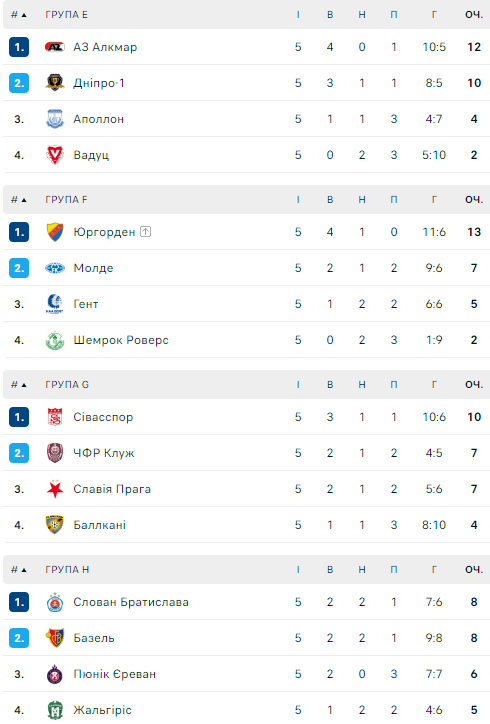 Определено 8 команд, которые гарантировали себе выход в плей-офф: «Истанбул Башакшехир», «Фиорентина», «Вест Хэм», «Вильярреал», АЗ Алкмар, «Днепр-1», «Юргорден», «Сивасспор».
