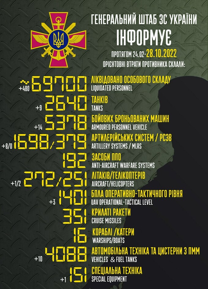 Предлагаем вашему вниманию сводку общих боевых потерь россии с 24.02 по 27.10.