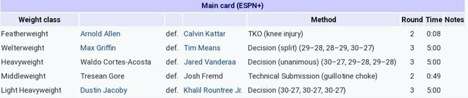 - Кэлвин Каттар – Арнольд Аллен – победа Аллена техническим нокаутом