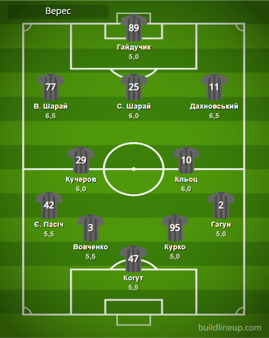 «Верес»: Когут – Е. Пасич, Вовченко, Курко, Гагун – Кучеров, Клец (Лебеденко, 78) – В. Шарай, С. Шарай (М. Шестаков, 85), Дахновский – Гайдучик (Сергийчук, 71).