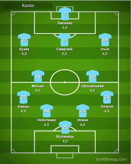 «Колос»: Волынец – Емец, Чоботенко, Новак, Зозуля – Милько, Ориховский (Богданов, 75) – Кузык (Болбат, 66), Смирный (Исаенко, 80), Ильин – Лысенко (Попов, 66).