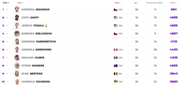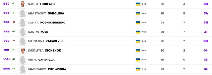 В парном рейтинге Людмила Киченок осталась на десятой позиции. В первой сотне также расположились Марта Костюк (46) и Надежда Киченок (84).