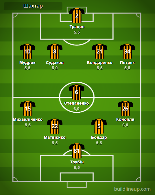 «Шахтер»: Трубин – Михайличенко, Матвиенко, Бондарь, Конопля (Л. Тейлор, 59) – Степаненко – Мудрик (Тотовицкий, 74), Судаков (Джурасек, 59), Бондаренко (Крыськив, 81), Петряк – Траоре (Сикан, 59).