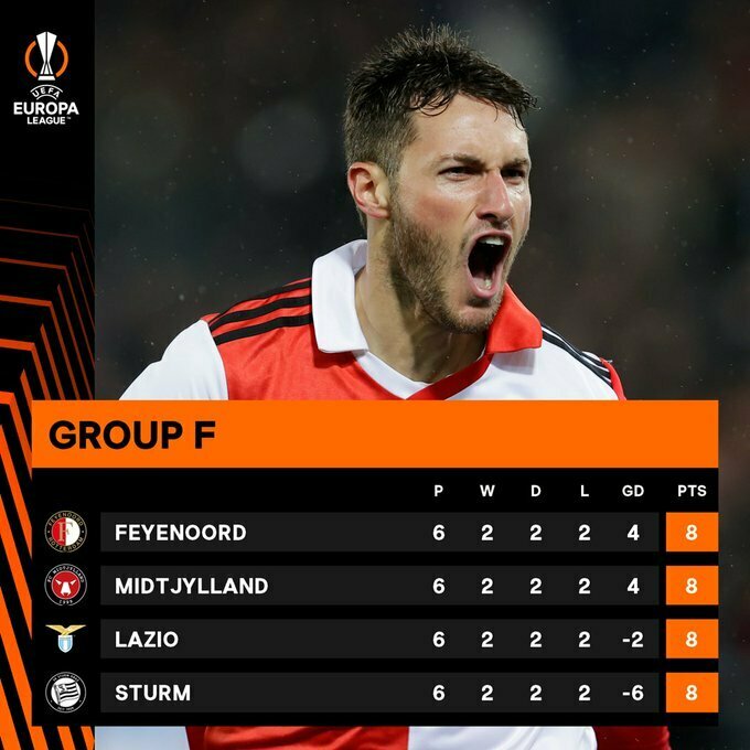 - 1. Фейенорд (Нидерланды) – 8 очков, мячи 13–9 (в 1/8 финала Лиги Европы)