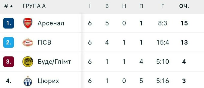 Первое место в группе А занял «Арсенал» с 15 очками, на втором позиции расположился ПСВ. Борьбу в Лиге конференций продолжит «Буде-Глимт», а «Цюрих» с 3 очками остался без евровесны.