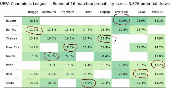 Матрица вероятностей встречи команд в 1/8 финала Лиги чемпионов