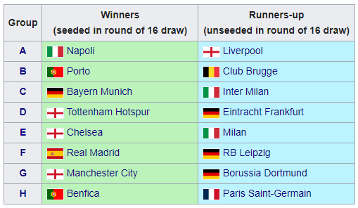 Победители групп: Наполи (Италия), Порту (Португалия), Бавария (Германия), Тоттенхэм (Англия), Челси (Англия), Реал (Испания), Манчестер Сити (Англия), Бенфика (Португалия).