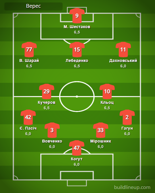 «Верес»: Когут – Е. Пасич, Вовченко, Мирошник, Гагун – Кучеров, Клец (Курко, 90+1) – В. Шарай (С. Шестаков, 90+1), Лебеденко (С. Шарай, 82), Дахновский (Сергийчук, 82) – М. Шестаков (Гайдучик, 67).