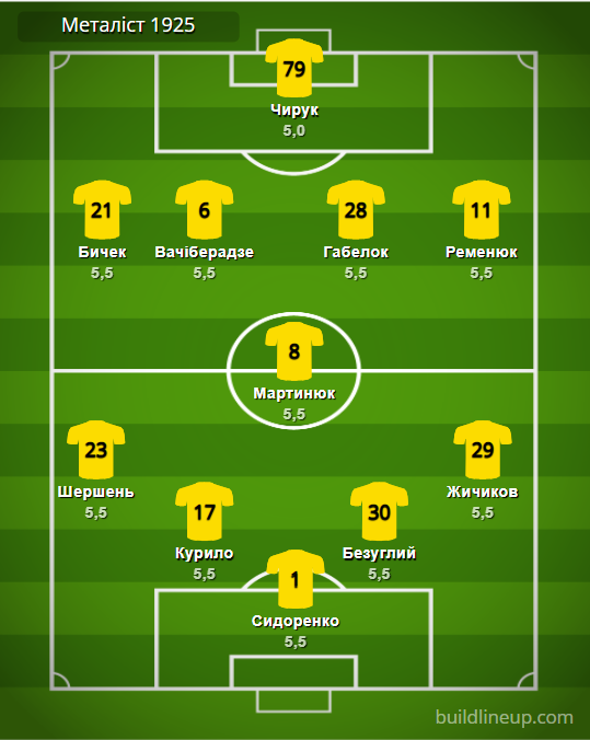 «Металлист 1925»: Сидоренко – Шершень, Курило, Безуглый, Жичиков – Мартынюк – Бычек (Дмитренко, 56), Вачиберадзе (Русин, 69), Габелок (Кравченко, 79), Ременюк (Капинус, 79) – Чирук (Зубков, 56).