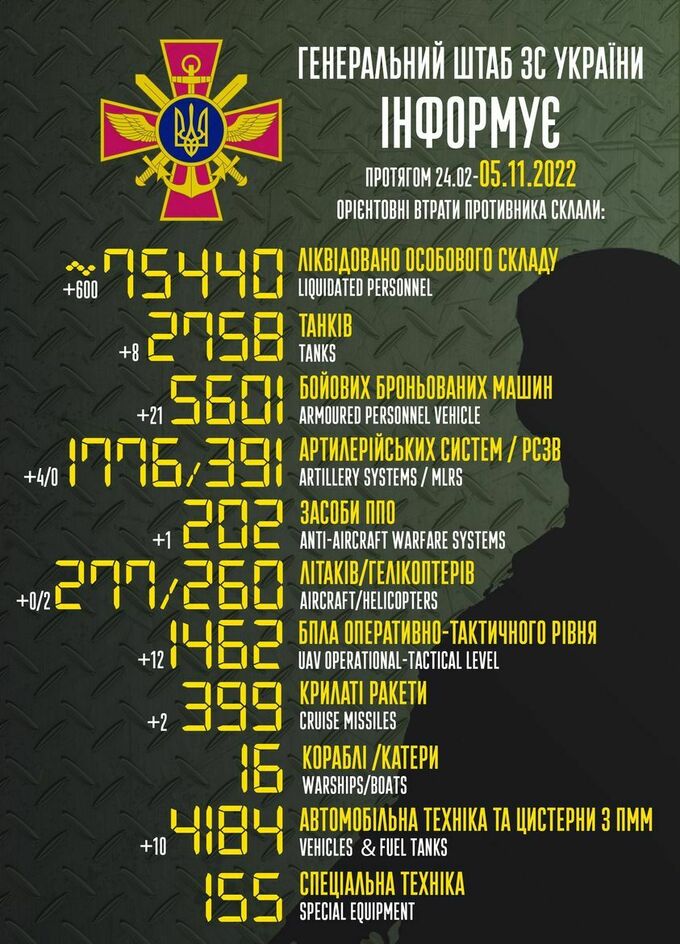 Предлагаем вашему вниманию сводку общих боевых потерь россии с 24.02 по 05.11.