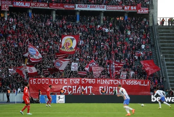 «15 тысяч смертей ради 5760 минут футбола. Позор вам», – гласит надпись на баннере фанатов «Баварии» и «Герты», намекая на большое число погибших мигрантов во время подготовки к соревнованиям.