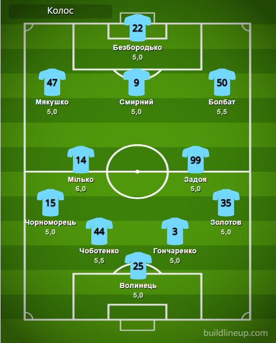 «Колос»: Волынец – Черноморец, Чоботенко, Гончаренко, Золотов – Милько, Задоя – Мякушко, Смирный, Болбат – Безбородько.