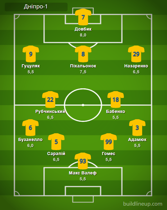 «Днепр-1»: Макс Валеф – Бузанелло, Сарапий, Гомес, Адамюк – Рубчинский, Бабенко – Гуцуляк, Пихаленок, Назаренко – Довбык.