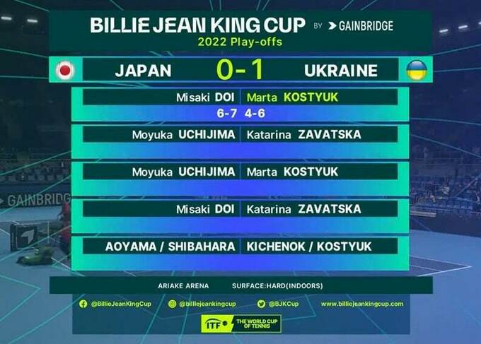 В стартовой встрече лидер сборной Марта Костюк (WTA 70) в напряженных двух сетах смогла обыграть представительницу Японии Мисаки Дои (WTA 180) за 1 час и 51 минуту.