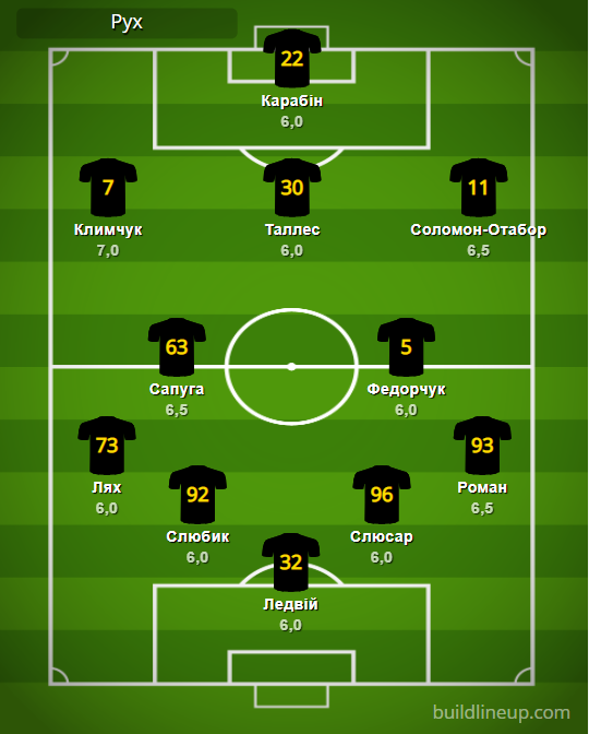 «Рух»: Ледвий – Лях, Слюбик, Слюсар, Роман – Сапуга, Федорчук (Довгий, 39) – Климчук, Таллес, Соломон-Отабор – Карабин (Альваренга, 70).