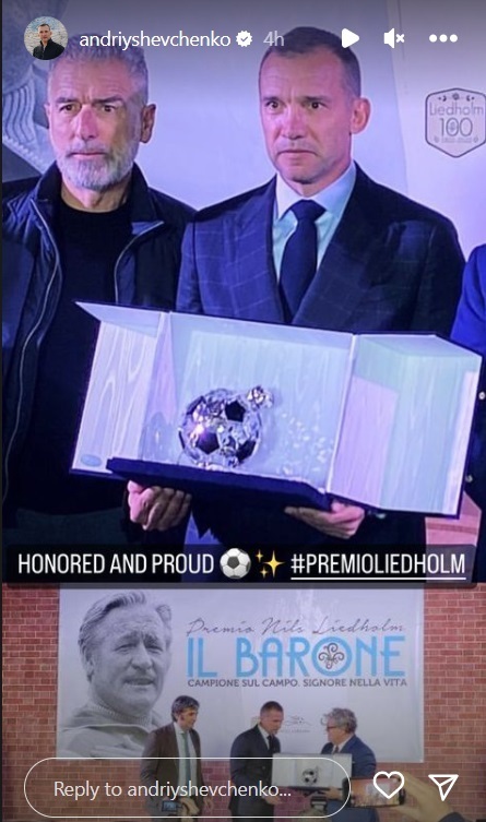 Шевченко наградили за «вклад в развитие футбола и большие результаты на международном уровне». Во время церемонии награждения Шевченко поблагодарил Италию за поддержку в войне с россией.