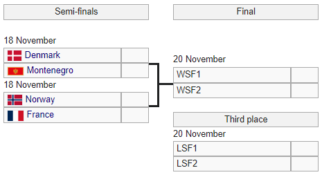 18 ноября в полуфиналах сыграют: Норвегия против Франции, Дания против Черногории. В матче за пятое место встретятся команды Швеции и Нидерландов.