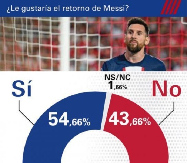 На прямой вопрос о возможном возвращении аргентинца преобладает «да», хотя и не слишком большая разница. 54,66% хотели бы видеть 35-летнего нападающего снова в составе «сине-гранатовых», тогда как 43,66% считают, что его время в клубе истекло, когда он перешел в «ПСЖ» летом 2021 года. 1,66% безразлично относятся к планам Месси на будущее.