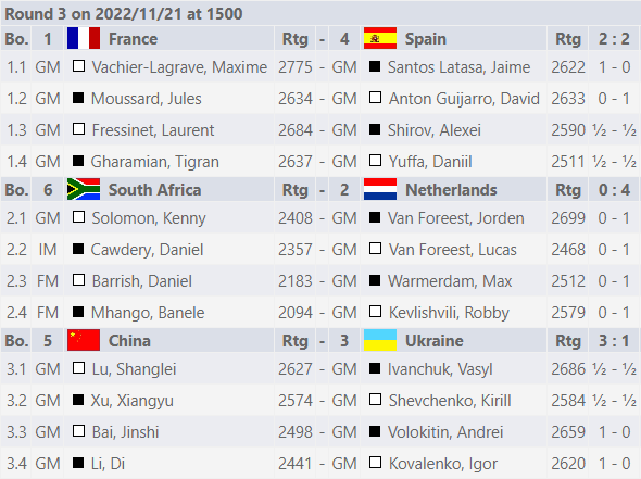 21 ноября сборная Украины в 3-м туре уступила команде Китая (1:3). Проиграли свои партии Андрей Волокитин и Игорь Коваленко.