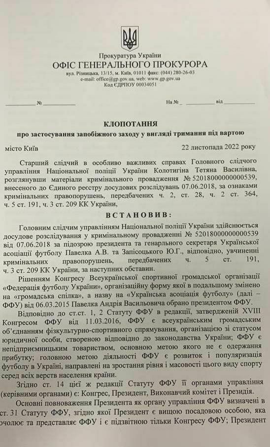 Президент УАФ Андрей Павелко и Генеральный секретарь украинской ассоциации Юрий Записоцкий во вторник, 22-го ноября, появились по вызову в Генеральной прокуратуре Украины. Первым, намного раньше руководителя УАФ, но позже оговоренных 11-ти часов утра, приехал Записоцкий.