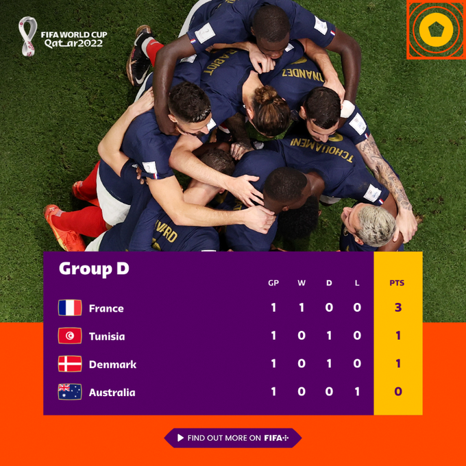 В группе D на чемпионате мира 2022 после первого тура лидирует фаворит турнира, сборная Франции.