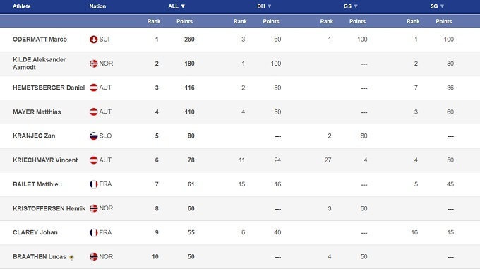 Ну а 160 очков Одерматта в двух скоростных гонках – отличное подтверждение его статуса главного фаворита в борьбе за БХГ. Напомним, что месяц назад швейцарец выиграл открытие сезона в гиганте в Зольдене: в трех гонках нынешнего сезона он каждый раз поднимался на подиум.
