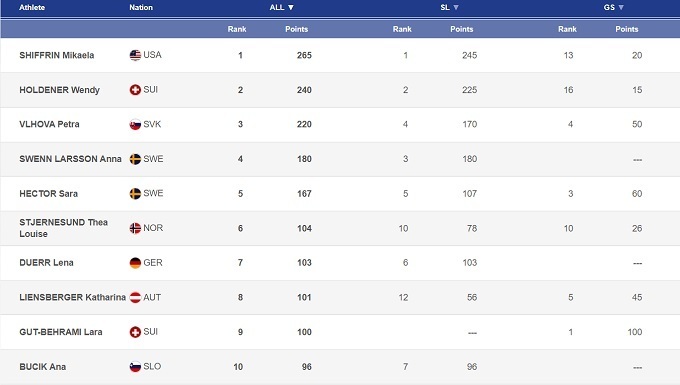 И вот в воскресенье Холденер до первой победы в слаломе таки добралась, при чем разделила ее с Анной Свенн-Ларссон! При чем, для шведки эта победа стала первой не только в слаломе, но и вообще на Кубке мира. Отметим, что на второй попытке шведка допустила довольно серьезную помарку, которая стоила ей примерно 0,3 – 0,4 секунды – шведка вполне могла снова оставить Холденер без первого места.