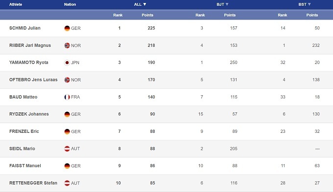 С преимуществом всего в 7 очков в общем зачете Кубка мира лидирует немец Юлиан Шмид, который победил в пятницу, а в субботу и воскресенье занял второе и пятое места соответственно. В свое время Шмид на юниорском уровне на равных боролся с Йоханнесом Лампартером, но столь же мгновенно ворваться в элиту ему не удалось. Но сейчас, похоже, для Юлиана наступает звездное время, в то время как Лампартер, кстати, старт сезона провалил: 13-е, 16-е и 7-е места.