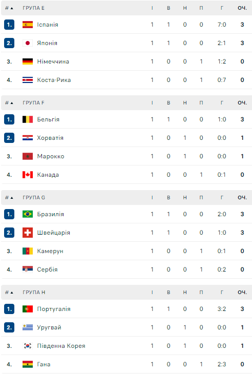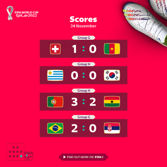 24 ноября на чемпионате мира 2022 в Катаре состоялись матчи первого тура в группах G и H.