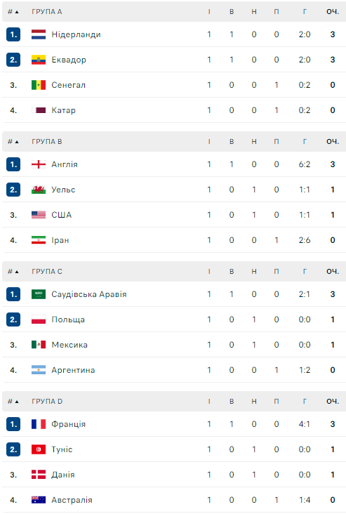 С 20 по 24 ноября 2022 года состоялись 16 матчей 1-го тура чемпионат мира 2022