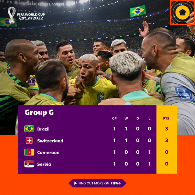 Вечером в последнем матче 1-го тура сборная Бразилии победила Сербию (2:0). Благодаря дублю Ришарлисона сборная Бразилии вышла в лидеры группы H.